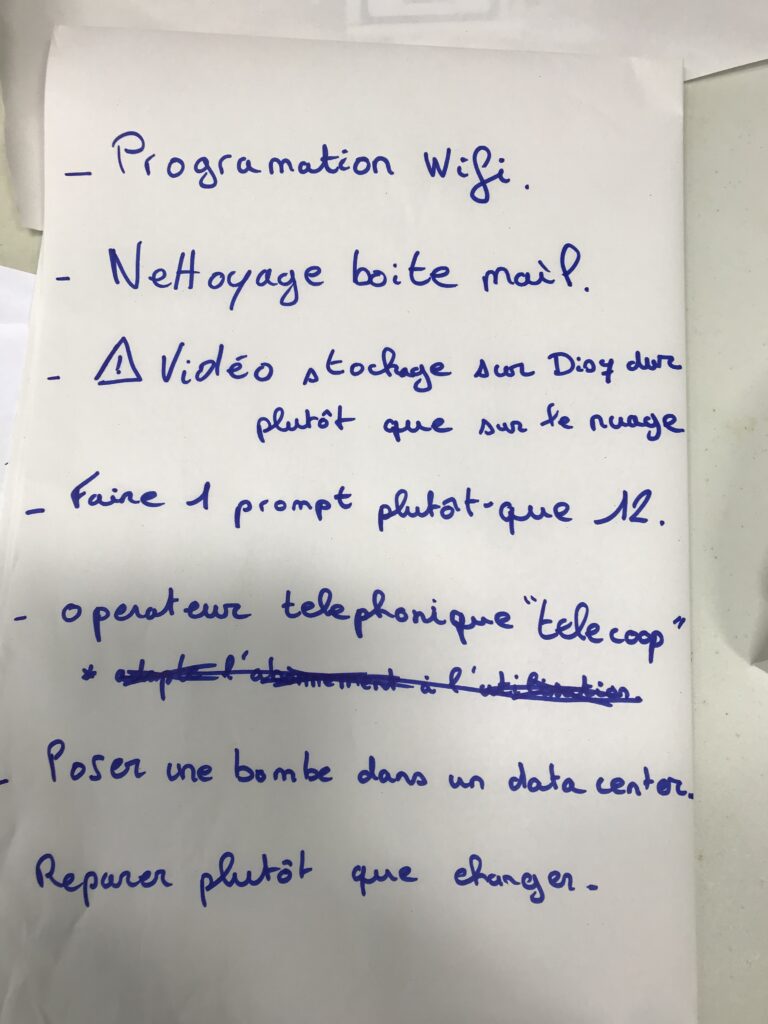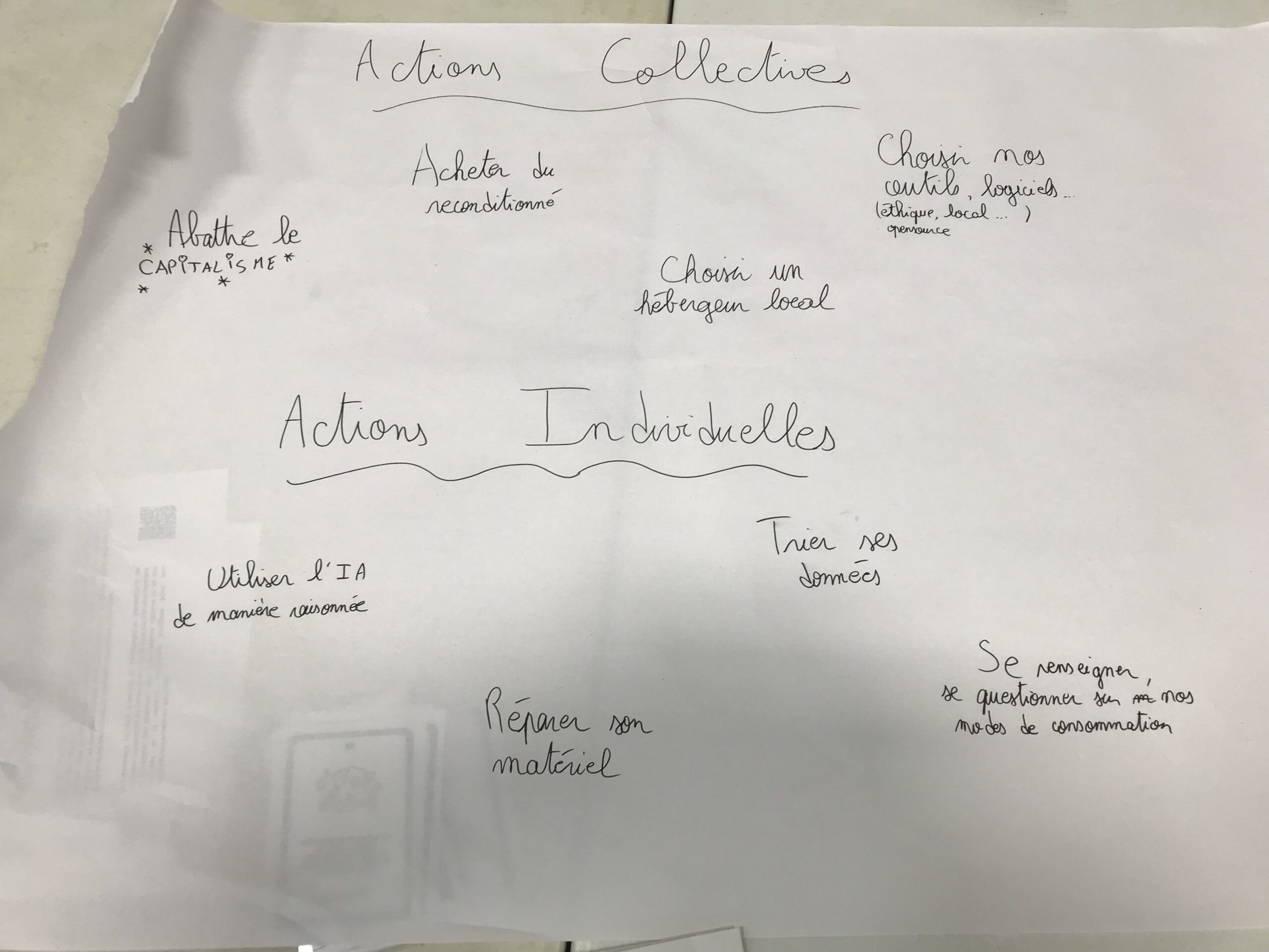 Réflexion en groupes sur des actions concrètes à mettre en œuvre pour réduire notre impact à l’échelle individuelle et au niveau collectif.